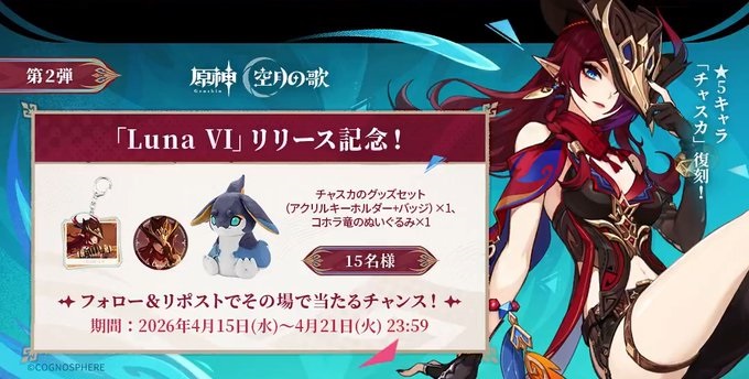 【毎日・X懸賞】原神グッズが15名様にその場で当たる! 2026.04.15原神 「Luna Ⅵ」リリース記念キャンペーン!第2弾 賞品:原神グッズ(15名様) 締切:2026年4月21日(火)原神公式Xアカウントをフォロー&対象ポストをリポストして、キャンペーンページからご応募ください。※詳細はキャンペーンページにてご確認ください。応募はこちらから