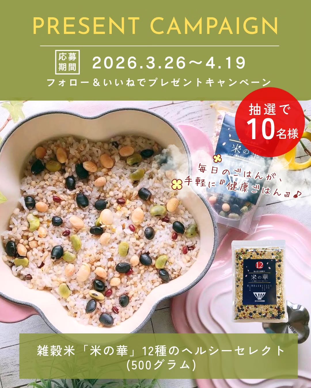 【Instagram懸賞】雑穀米「米の華」12種のヘルシーセレクトを10名様にプレゼント 2026.04.16健やか総本舗亀山堂‐フォロー&いいねキャンペーン 賞品:雑穀米「米の華」(10名様) 締切:2026年4月19日(日)応募方法: 1. 公式Instagramアカウントをフォロー 2. 対象の投稿に「いいね!」※詳細はキャンペーンページにてご確認ください。応募はこちらから