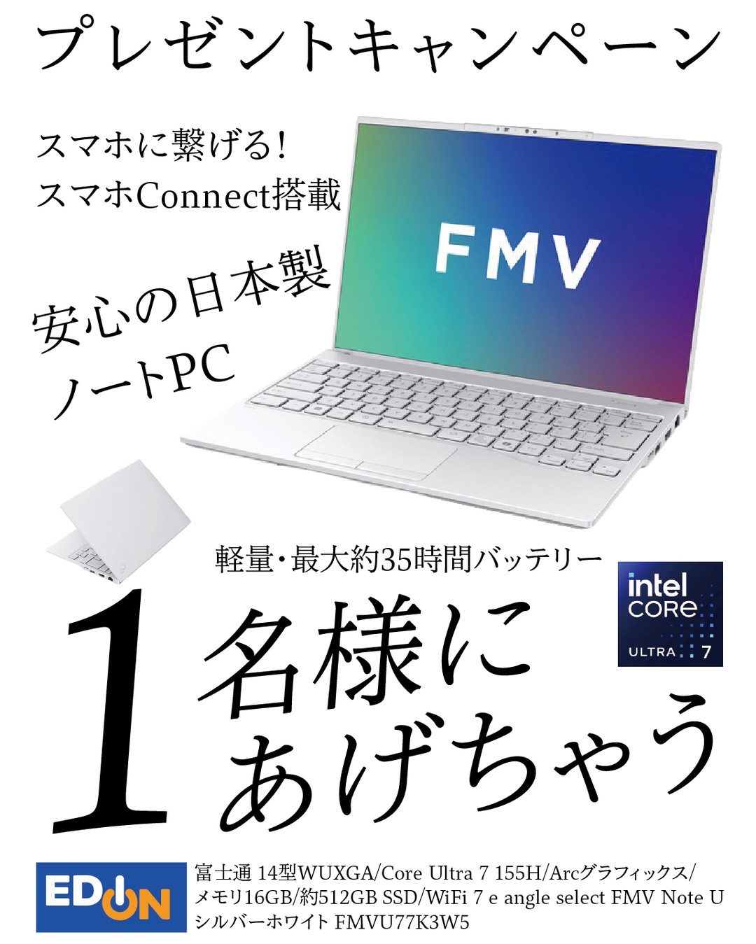 【Instagram懸賞】ノートパソコン e angle FMV Note Uを1名様にプレゼント 2026.04.16エディオン‐プレゼントキャンペーン 賞品:e angle FMV Note U(1名様) 締切:2026年4月19日(日)エディオン公式(@official_edion)をフォローとコメントで応募完了です。※詳細はキャンペーンページにてご確認ください。応募はこちらから
