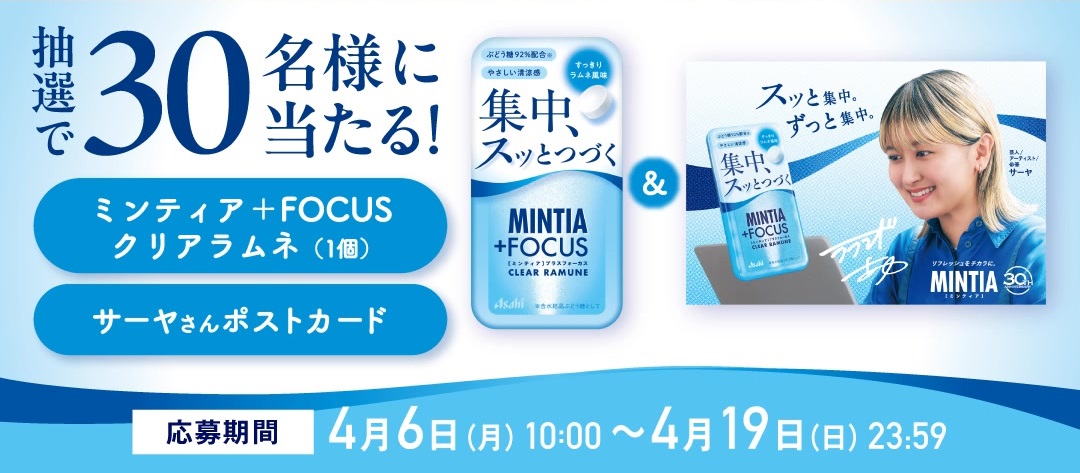 賞品:ミンティア+FOCUS クリアラムネ&サーヤさんサイン入りポストカード(30名様)