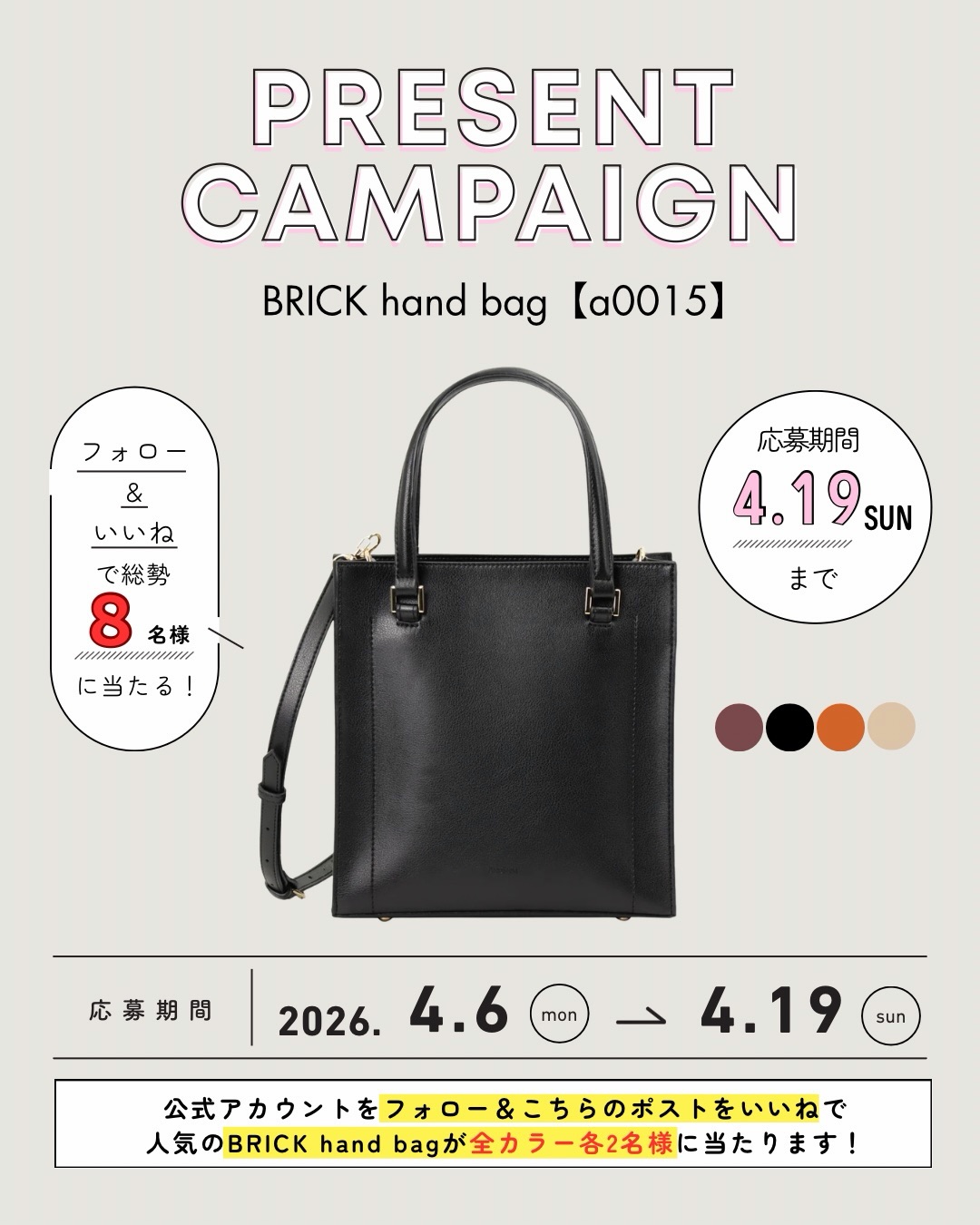 賞品:ANDSHINの人気シリーズ BRICK hand bag a0015(8名様)