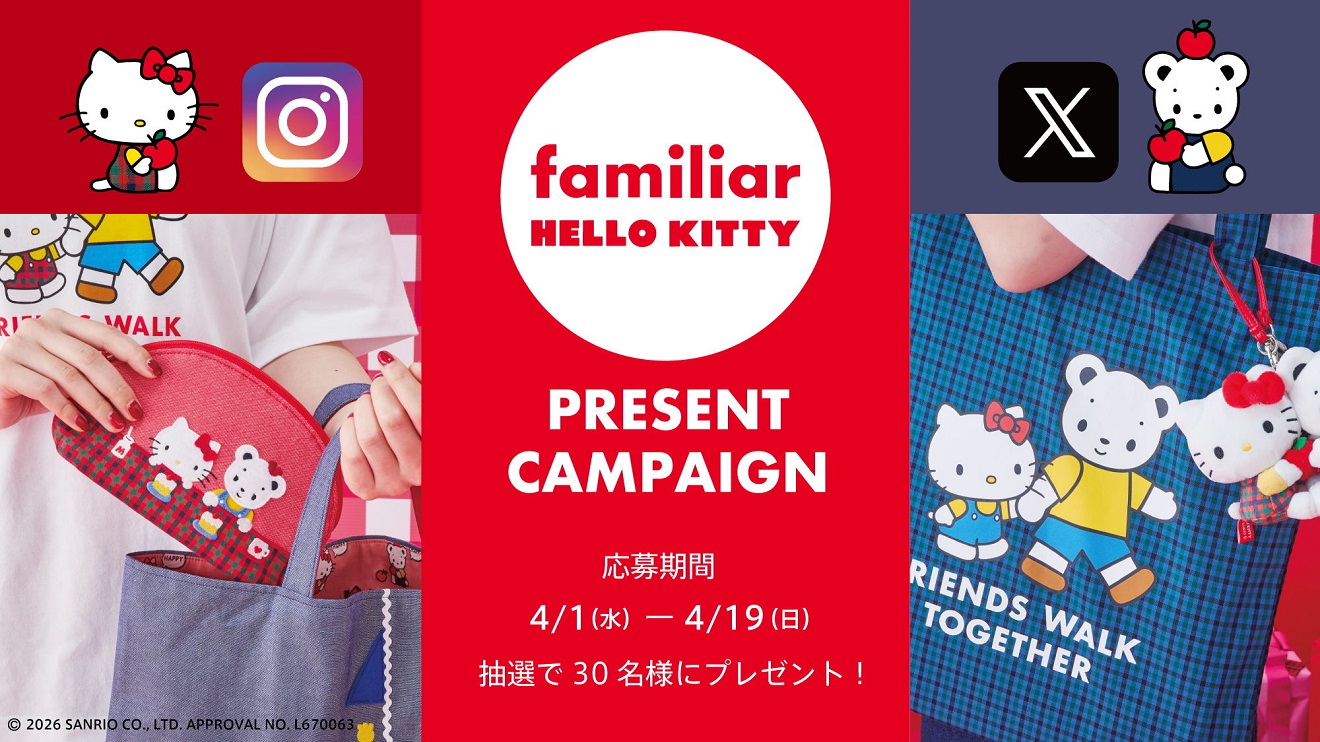 【X・Instagram懸賞】ハローキティ×familiarコラボアイテムを合計30名様にプレゼント 2026.04.16ファミリア‐ハローキティ×familiarコラボ記念キャンペーン 賞品:ハローキティ×familiarコラボアイテム(合計30名様) 締切:2026年4月19日(日)familiar公式Xをフォローし、こちらの投稿を引用リポストしていただいた方の中から、抽選で10名様にコラボアイテムをプレゼント🍏Instagramからも応募できます。※詳細はキャンペーンページにてご確認ください。応募はこちらから