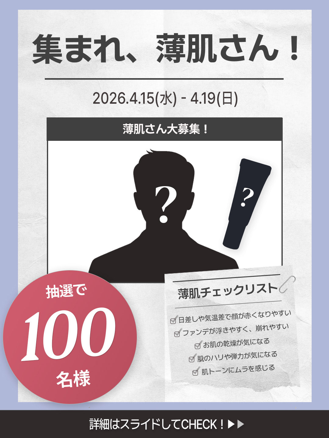 【X・Instagram懸賞】ダーマカバーブレミッシュバームミニ2色&自分の肌に合う色の現品1種を100名様にプレゼント 2026.04.16Espoir Japan‐#EVENT 集まれ、薄肌さん!100名大募集 賞品:ダーマカバーブレミッシュバームミニ2色&自分の肌に合う色の現品1種(100名様) 締切:2026年4月19日(日)espoirの新商品「NEW ダーマカバーブレミッシュバーム」を誰よりも早く体験できるチャンス!Instagramからも応募できます。※詳細はキャンペーンページにてご確認ください。応募はこちらから