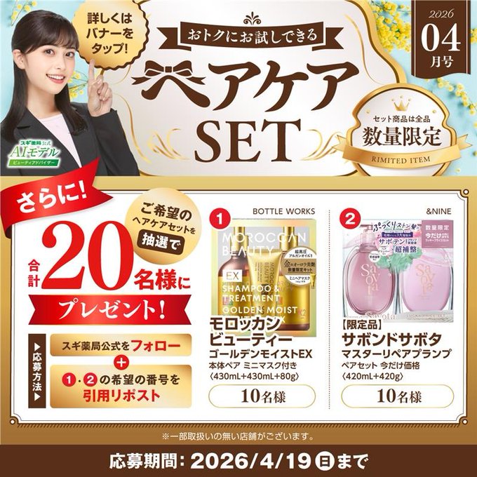 【X懸賞】お好きなヘアケアセットを20名様にプレゼント 2026.04.16スギ薬局‐プレゼントキャンペーン 賞品:お好きなヘアケアセット(20名様) 締切:2026年4月19日(日)①@SUGIofficial_JPをフォロー ②希望の番号を引用リポスト※詳細はキャンペーンページにてご確認ください。応募はこちらから