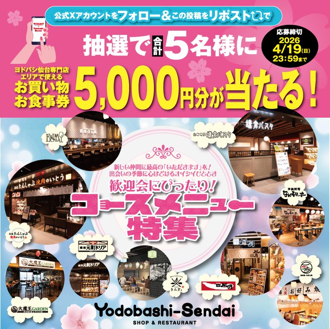 【X懸賞】ヨドバシ仙台 専門店街で使えるお買い物・お食事券5,000円分を5名様にプレゼント
