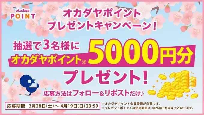 賞品:オンラインショップでも使えるオカダヤポイント5,000円分(3名様)