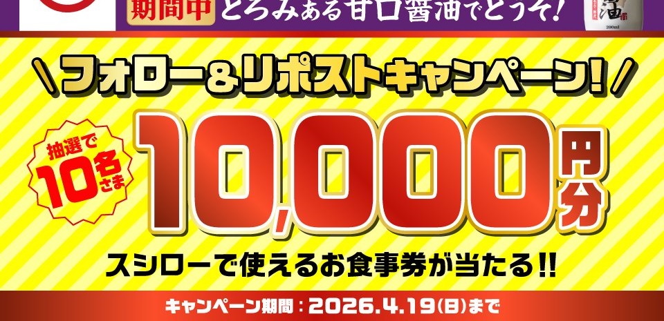 【X懸賞】スシローで使えるお食事券10,000円分を10名様にプレゼント 2026.04.17スシロー‐プレゼントキャンペーン 賞品:お食事券10,000円分(10名様) 締切:2026年4月19日(日)1⃣@akindosushiroco をフォロー📲 2⃣投稿をいいね❤&リポスト🔃※詳細はキャンペーンページにてご確認ください。応募はこちらから