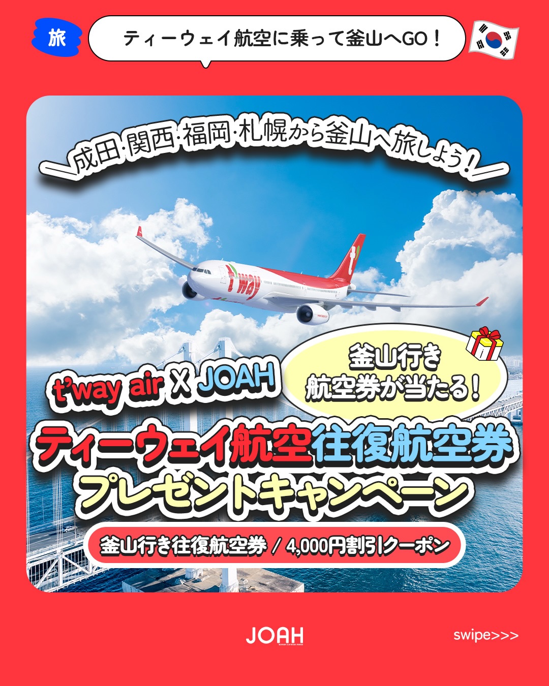 【Instagram懸賞】釜山 往復航空券、ティーウェイ航空 4,000円割引クーポンを合計11名様にプレゼント