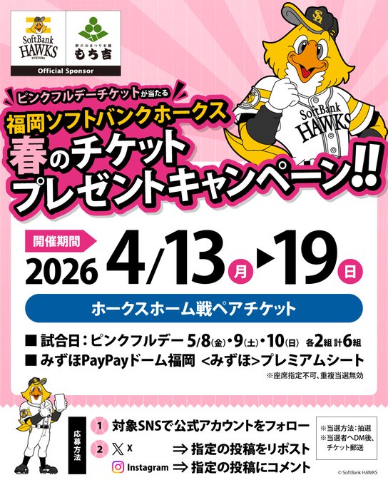 【X・Instagram懸賞】ホークスピンクフルデーペアチケットを6組様にプレゼント 2026.04.17もち吉‐プレゼントキャンペーン 賞品:ホークスピンクフルデーペアチケット(6組様) 締切:2026年4月19日(日)公式X(Twitter)アカウントをフォロー&キャンペーン対象ポストをリポストしてご応募ください。Instagramからも応募できます。※詳細はキャンペーンページにてご確認ください。応募はこちらから