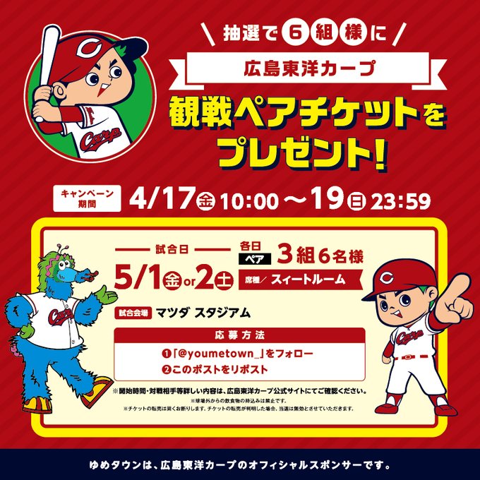賞品:5/1(金) or 5/2(土)の広島東洋カープ観戦スィートルームペアチケット(6組様)