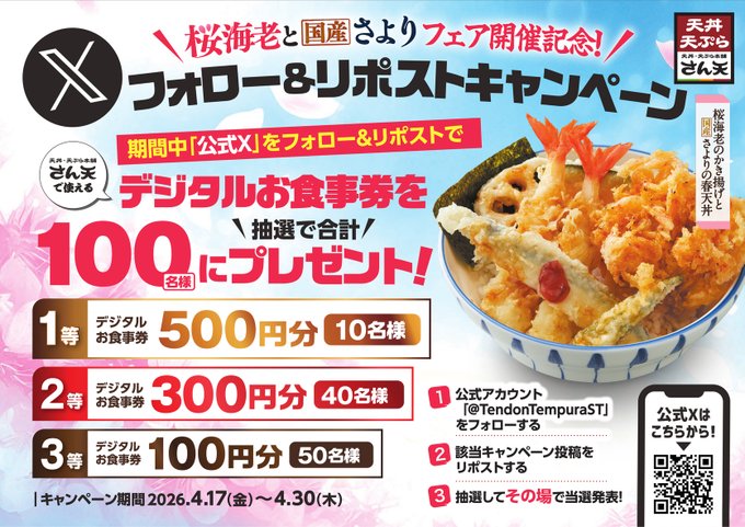 天丼・天ぷら本舗 さん天公式Xアカウントをフォロー&キャンペーン対象ポストをリポストして、記載されているURLからご応募ください。