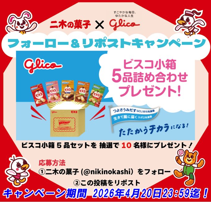 【X懸賞】ビスコ小箱5品セットを10名様にプレゼント 2026.04.18二木の菓子‐フォロー&リポストキャンペーン 賞品:ビスコ小箱5品セット(10名様) 締切:2026年4月20日(月)公式X(Twitter)アカウントをフォロー&キャンペーン対象ポストをリポストしてご応募ください。※詳細はキャンペーンページにてご確認ください。応募はこちらから
