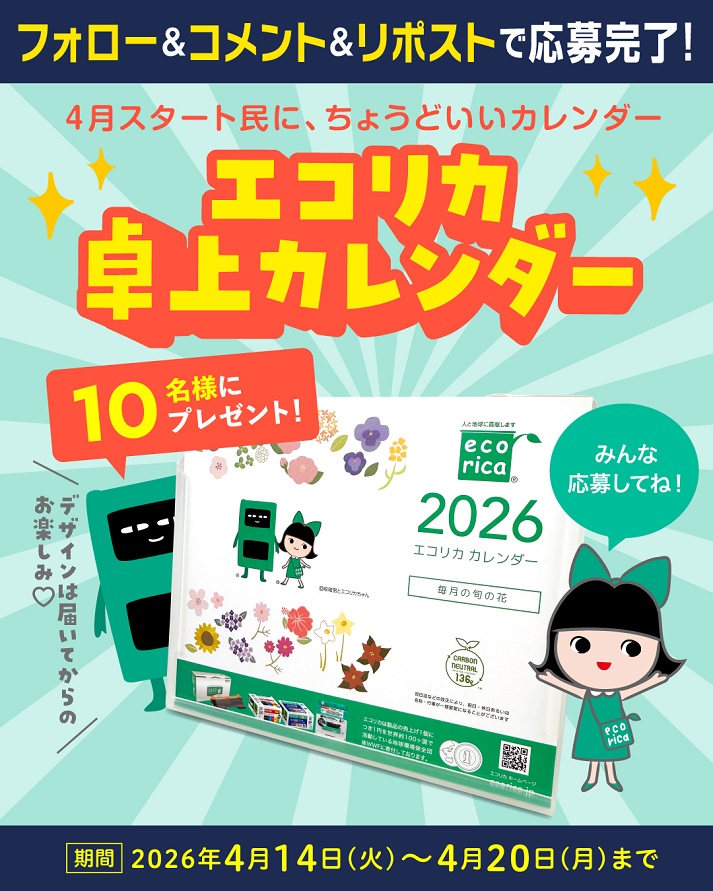 【X懸賞】エコリカ卓上カレンダーを10名様にプレゼント 2026.04.18株式会社エコリカ‐新生活応援キャンペーン 賞品:エコリカ カレンダー(10名様) 締切:2026年4月20日(月)公式X(Twitter)アカウントをフォロー&キャンペーン対象ポストをリポストしてご応募ください。※詳細はキャンペーンページにてご確認ください。応募はこちらから