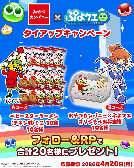 【X懸賞】ベビースターラーメン(チキン味)ミニ 30食、おやつカンパニー×ぷよクエ オリジナルお弁当箱を合計20名様にプレゼント