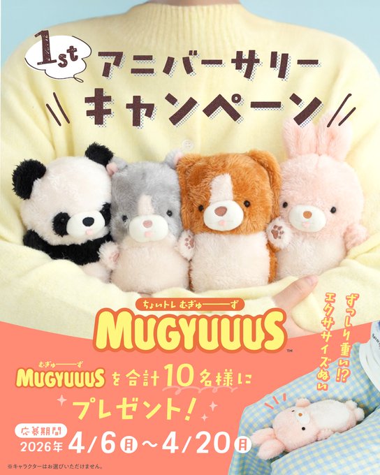 【X懸賞】MUGYUUUSを10名様にプレゼント 2026.04.18MUGYUUUS‐フォロー&リポストキャンペーン 賞品:MUGYUUUS(10名様) 締切:2026年4月20日(月)公式X(Twitter)アカウントをフォロー&キャンペーン対象ポストをリポストしてご応募ください。※詳細はキャンペーンページにてご確認ください。応募はこちらから