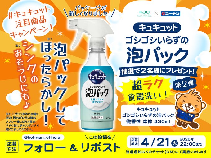 賞品:花王 キュキュット ゴシゴシいらずの泡パック(2名様)