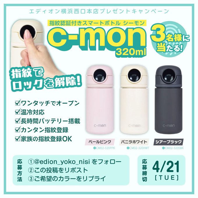 賞品:指紋認証付きスマートボトル シーモン(c-mon)320ml(3名様)