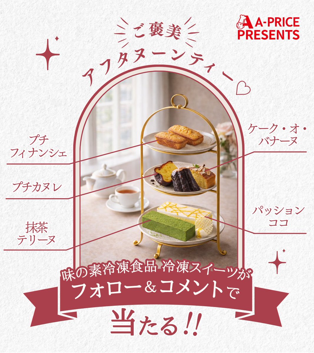 【X懸賞】味の素冷凍食品 冷凍スイーツ5個セットを10名様にプレゼント 2026.04.19A-プライス‐ひとり占め?それともシェア? 賞品:味の素冷凍食品 冷凍スイーツ5個セット(10名様) 締切:2026年4月21日(火)1)アカウントをフォロー 2)コメントで『ひとり占め』『シェア』どちら派か回答!※詳細はキャンペーンページにてご確認ください。応募はこちらから