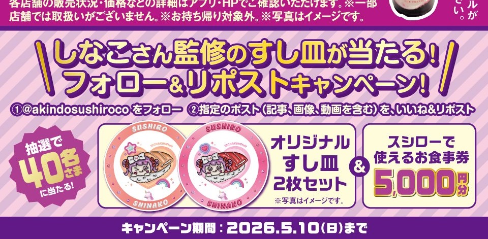 賞品:オリジナルすし皿2枚セット&お食事券5,000円分(40名様)
