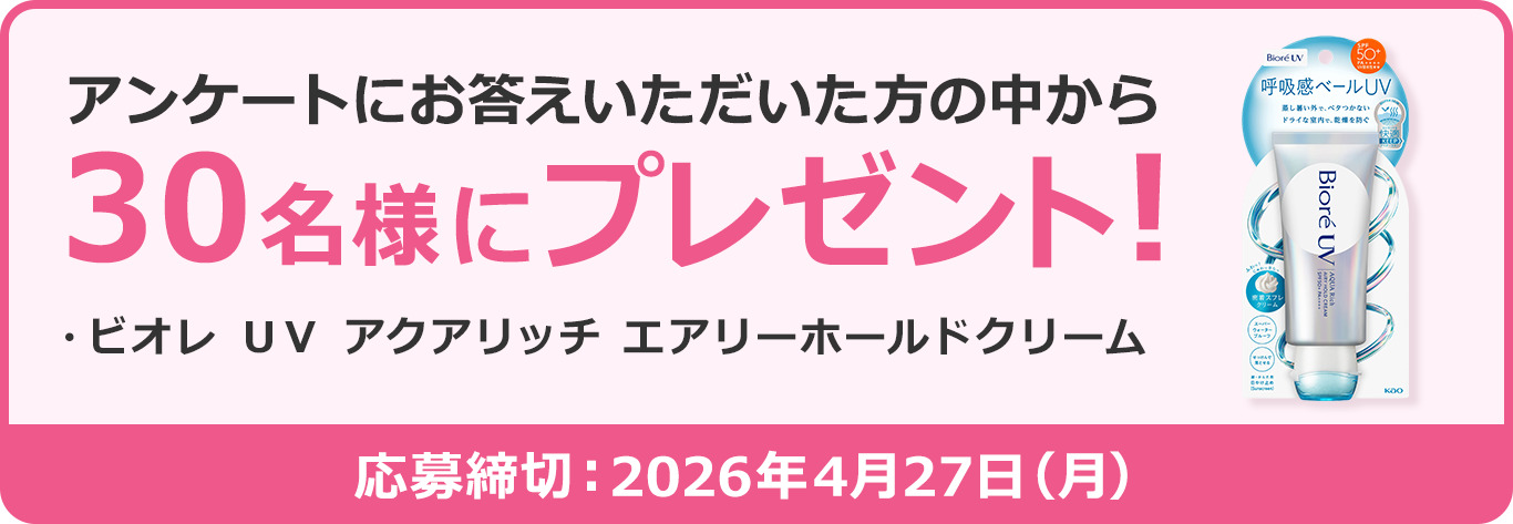 ビオレ UV アクアリッチ エアリーホールドクリームを30名様にプレゼント 2026.04.19My Kao‐プレゼントキャンペーン 賞品:ビオレ UV アクアリッチ エアリーホールドクリーム(30名様) 締切:2026年4月27日(月)アンケートに答えてご応募ください。※詳細はキャンペーンページにてご確認ください。応募はこちらから