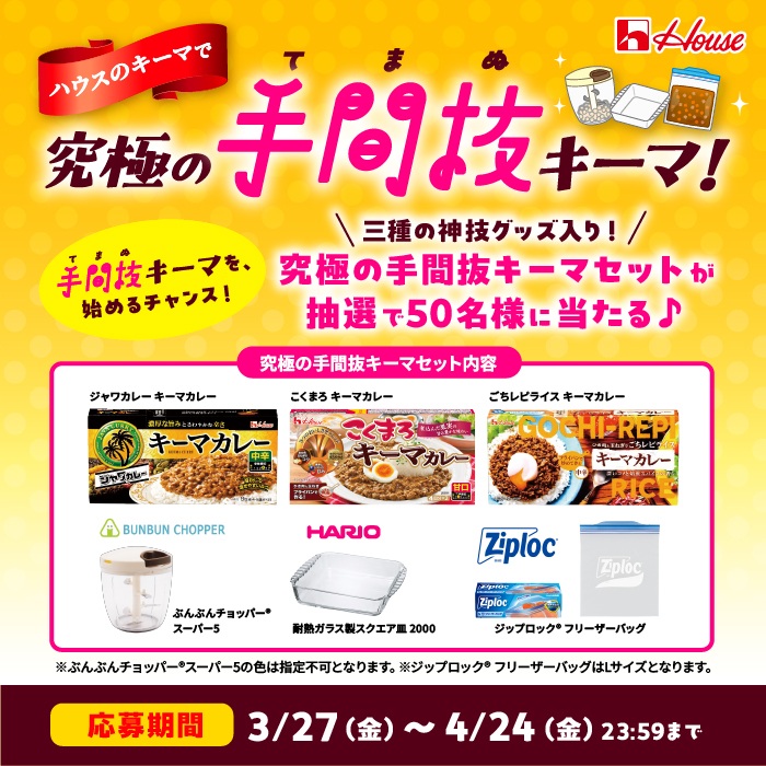 三種の神技グッズ入り!究極の手間抜キーマセットを50名様にプレゼント 2026.04.19ハウス食品‐手間抜キーマを、始めるチャンス! 賞品:三種の神技グッズ入り! 究極の手間抜キーマセット(50名様) 締切:2026年4月24日(金)応募フォームより必要事項を入力してご応募ください。※詳細はキャンペーンページにてご確認ください。応募はこちらから