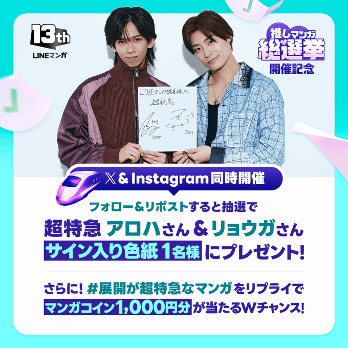 賞品:超特急 #アロハ さん& #リョウガ さん サイン入り色紙、LINEマンガコイン1,000円分(合計14名様)