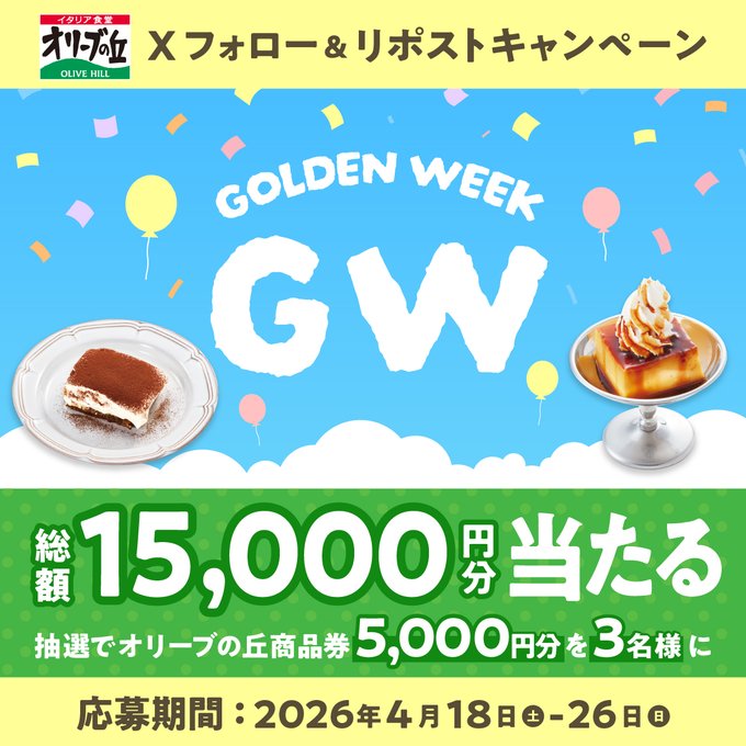 イタリア食堂 オリーブの丘公式Xアカウントをフォロー&キャンペーン対象ポストをリポストしてご応募ください。