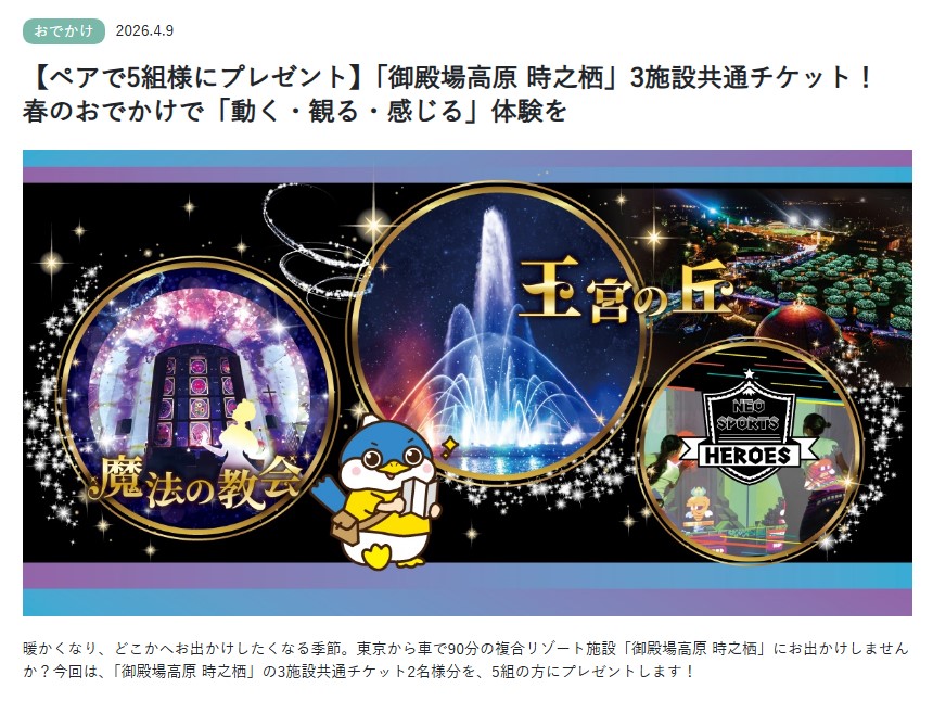 「御殿場高原 時之栖」3施設共通チケット2枚を5組様にプレゼント 2026.04.21 2026.04.20HugKum‐プレゼントキャンペーン 賞品:「御殿場高原 時之栖」3施設共通チケット2枚(5組様) 締切:2026年4月23日(木)ご応募には会員登録/ログインが必要です。※詳細はキャンペーンページにてご確認ください。応募はこちらから