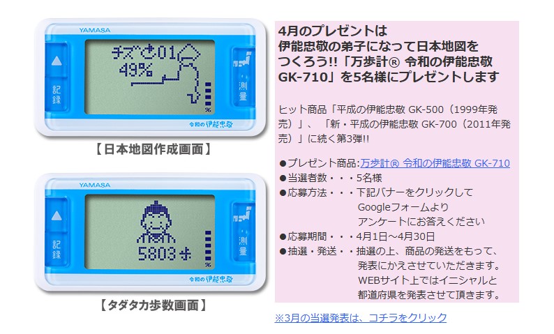 賞品:万歩計® 令和の伊能忠敬 GK-710(5名様)