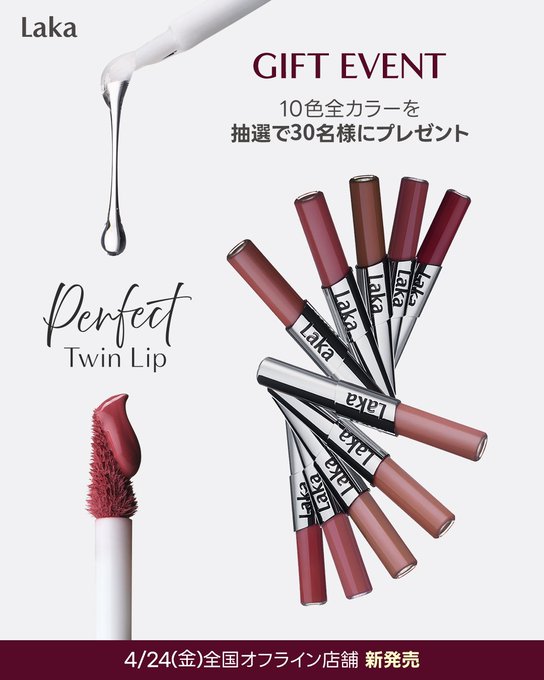 【X懸賞】Laka パーフェクトツインリップ 10色フルセットを30名様にプレゼント 2026.04.21Laka|日本‐パーフェクトツインリップ 300本プレゼントキャンペーン 賞品:10色フルセット(30名様) 締切:2026年4月21日(火)応募方法:投稿をRTするだけ♪※詳細はキャンペーンページにてご確認ください。応募はこちらから