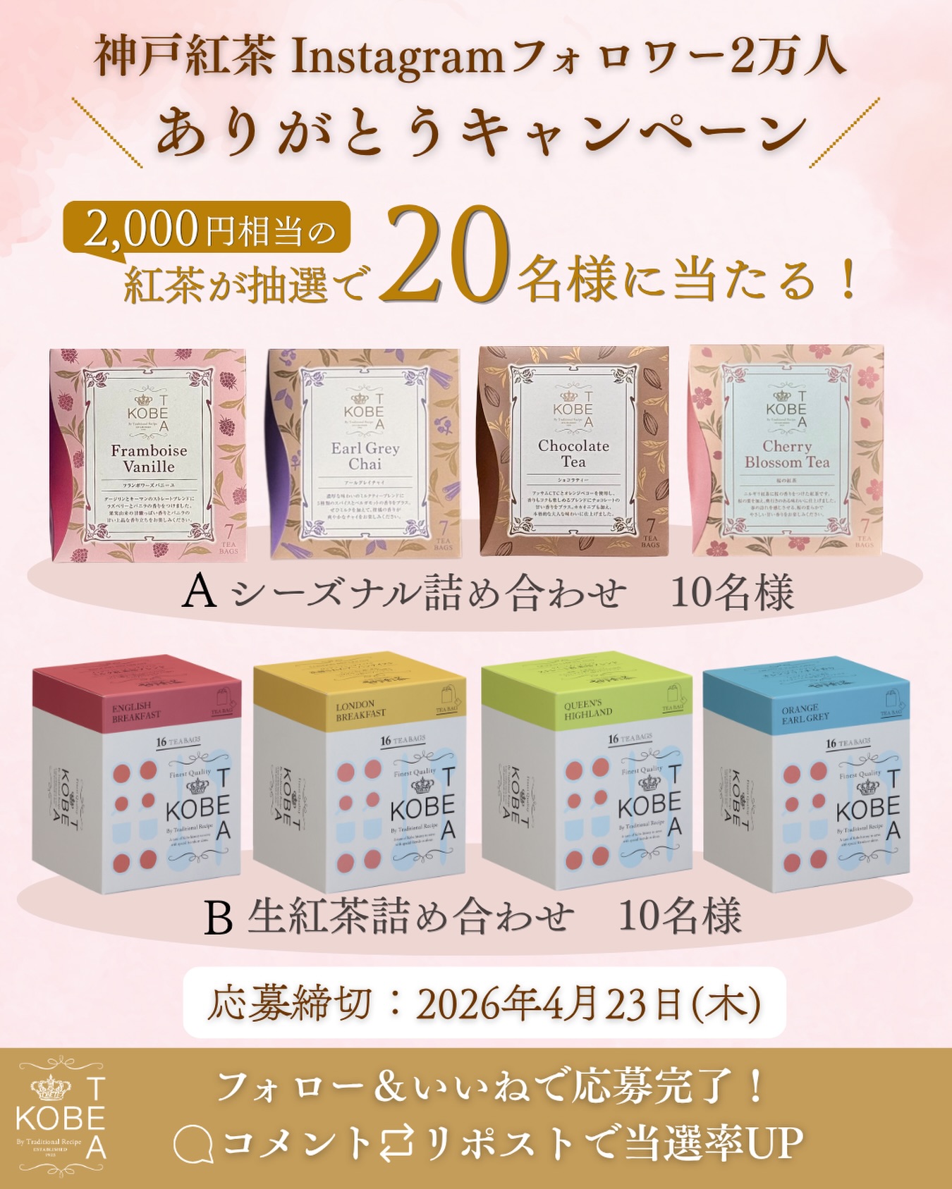 【Instagram懸賞】人気紅茶詰め合わせを20名様にプレゼント 2026.04.22神戸紅茶 Instagramフォロワー2万人突破記念 賞品:人気紅茶詰め合わせ(20名様) 締切:2026年4月23日(木)応募方法: 1. 公式Instagramアカウントをフォロー 2. 対象の投稿に「いいね!」※詳細はキャンペーンページにてご確認ください。応募はこちらから