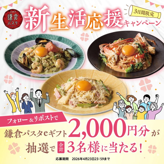 【X懸賞】鎌倉パスタeギフト2,000円分を3名様にプレゼント 2026.04.22鎌倉パスタ 新生活応援キャンペーン 賞品:eギフト2000円分(3名様) 締切:2026年4月23日(木)公式X(Twitter)アカウントをフォロー&キャンペーン対象ポストをリポストしてご応募ください。※詳細はキャンペーンページにてご確認ください。応募はこちらから
