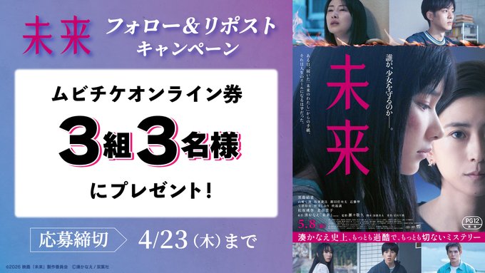 【X懸賞】『未来』ムビチケを3名様にプレゼント 2026.04.22シネマワールド‐『未来』公開記念 賞品:『未来』ムビチケ(3名様) 締切:2026年4月23日(木)公式X(Twitter)アカウントをフォロー&キャンペーン対象ポストをリポストしてご応募ください。※詳細はキャンペーンページにてご確認ください。応募はこちらから