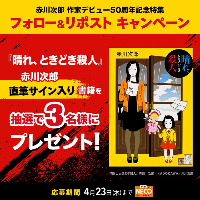 賞品:『晴れ、ときどき殺人』赤川次郎直筆サイン入り書籍(3名様)