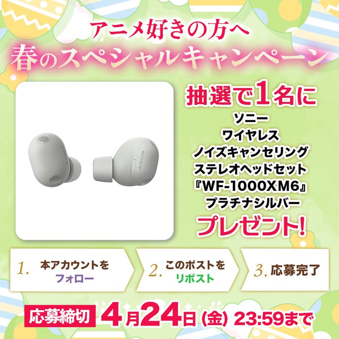 賞品:ソニー ワイヤレスノイズキャンセリング ステレオヘッドセット 『WF-1000XM6』 プラチナシルバー(1名様)