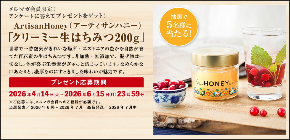 賞品:ArtisanHoney クリーミー生はちみつ200g(5名様)