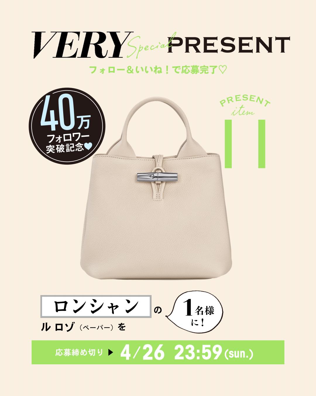 【Instagram懸賞】ロンシャンのバッグを1名様にプレゼント 2026.04.23VERY‐フォロー&いいねキャンペーン 賞品:ロンシャンのバッグ(1名様) 締切:2026年4月26日(日)応募方法: 1. 公式Instagramアカウントをフォロー 2. 対象の投稿に「いいね!」※詳細はキャンペーンページにてご確認ください。応募はこちらから