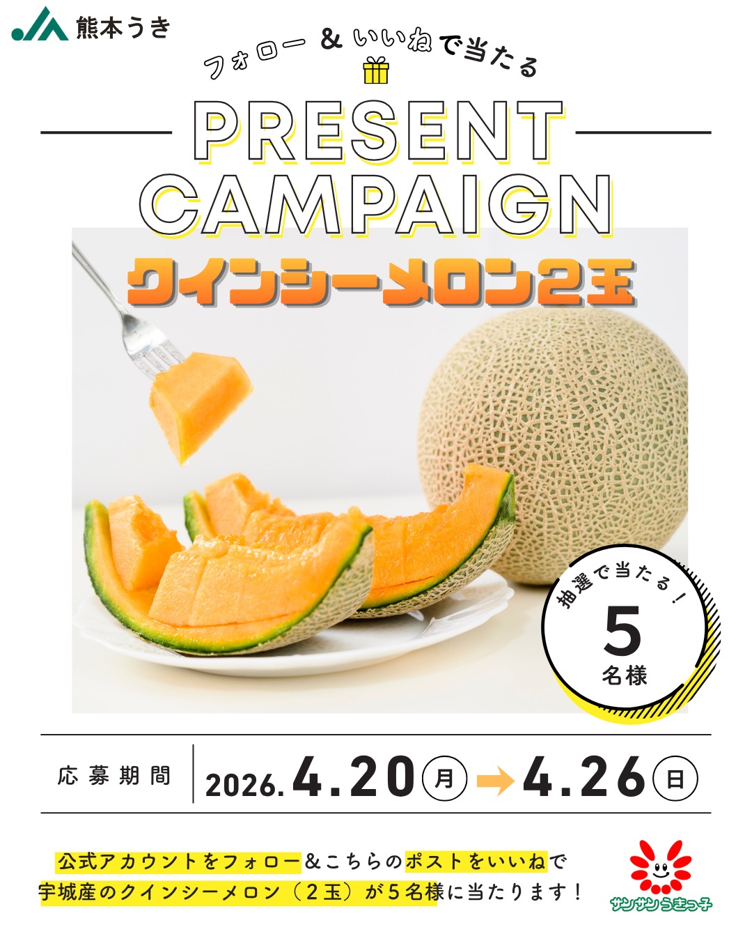 【Instagram懸賞】クインシーメロン2玉を5名様にプレゼント 2026.04.23JA熊本うき‐フォロー&いいねキャンペーン 賞品:クインシーメロン2玉(5名様) 締切:2026年4月26日(日)応募方法: 1. 公式Instagramアカウントをフォロー 2. 対象の投稿に「いいね!」※詳細はキャンペーンページにてご確認ください。応募はこちらから