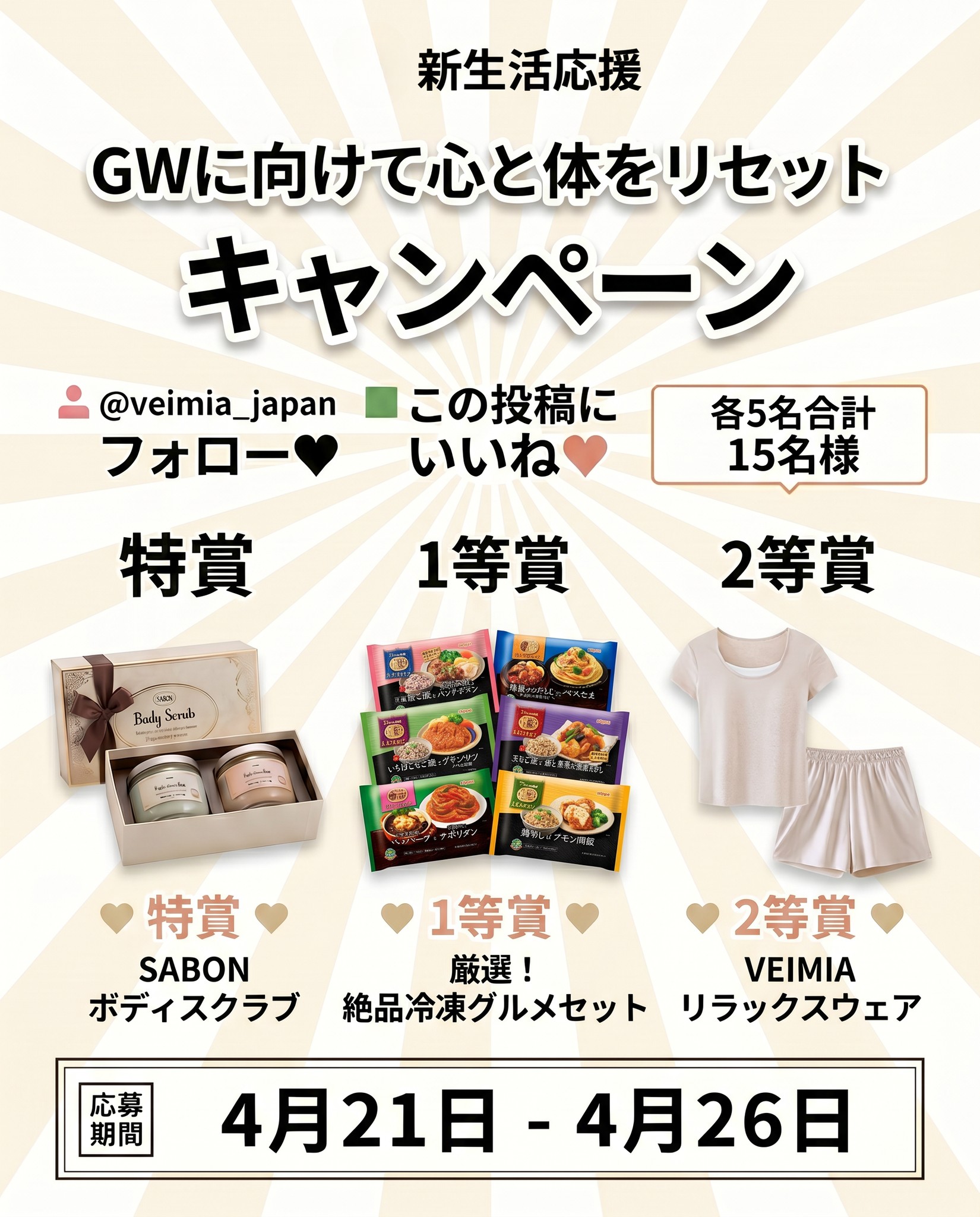 賞品:SABON ボディスクラブ、絶品冷凍グルメセット、VEIMIA リラックスウェア(合計15名様)
