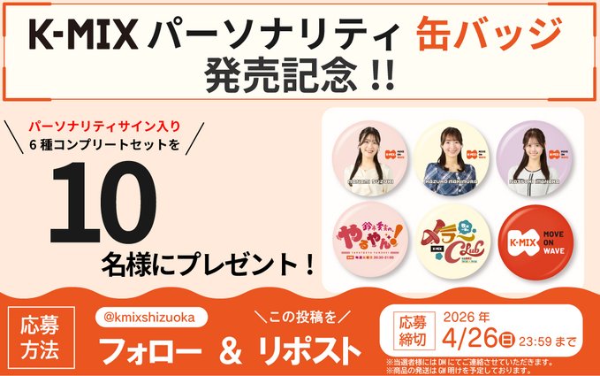 賞品:K-MIXパーソナリティ缶バッジ サイン入り6種コンプリートセット(10名様)
