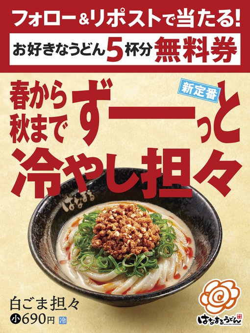 【毎日・X懸賞】お好きなうどん無料券が10名様にその場で当たる! 2026.04.24 2026.04.23はなまるうどん‐フォロー&リポストキャンペーン 賞品:お好きなうどん無料券(10名様) 締切:不明はなまるうどん公式Xアカウントをフォロー&キャンペーン対象ポストをリポストしてご応募ください。※詳細はキャンペーンページにてご確認ください。応募はこちらから
