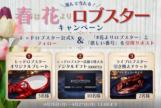 【X懸賞】レッドロブスター オリジナルプレート、レッドロブスター店舗で使えるデジタルギフト、ライブロブスター 引き換えチケットを合計15名様にプレゼント