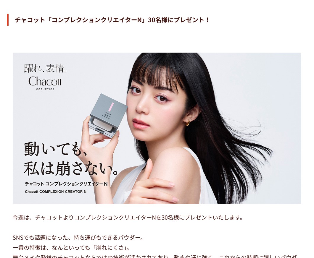 チャコット コンプレクションクリエイターNを30名様にプレゼント 2026.04.25王様のブランチ‐プレゼントキャンペーン 賞品:チャコット コンプレクションクリエイターN(30名様) 締切:2026年4月26日(日)応募フォームより必要事項を入力してご応募ください。※詳細はキャンペーンページにてご確認ください。応募はこちらから