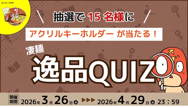 ねぎみその逸品 アクリルキーホルダーを15名様にプレゼント 2026.04.25すごめんち‐凄麺逸品QUIZ 賞品:ねぎみその逸品 アクリルキーホルダー(15名様) 締切:2026年4月29日(水)ご応募には会員登録/ログインが必要です。※詳細はキャンペーンページにてご確認ください。応募はこちらから