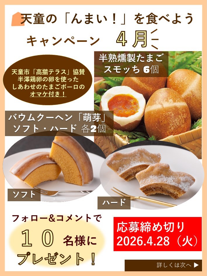 賞品:バウムクーヘン「萌芽」&半熟燻製たまご「スモッち」&しあわせのたまごボーロ(10名様)
