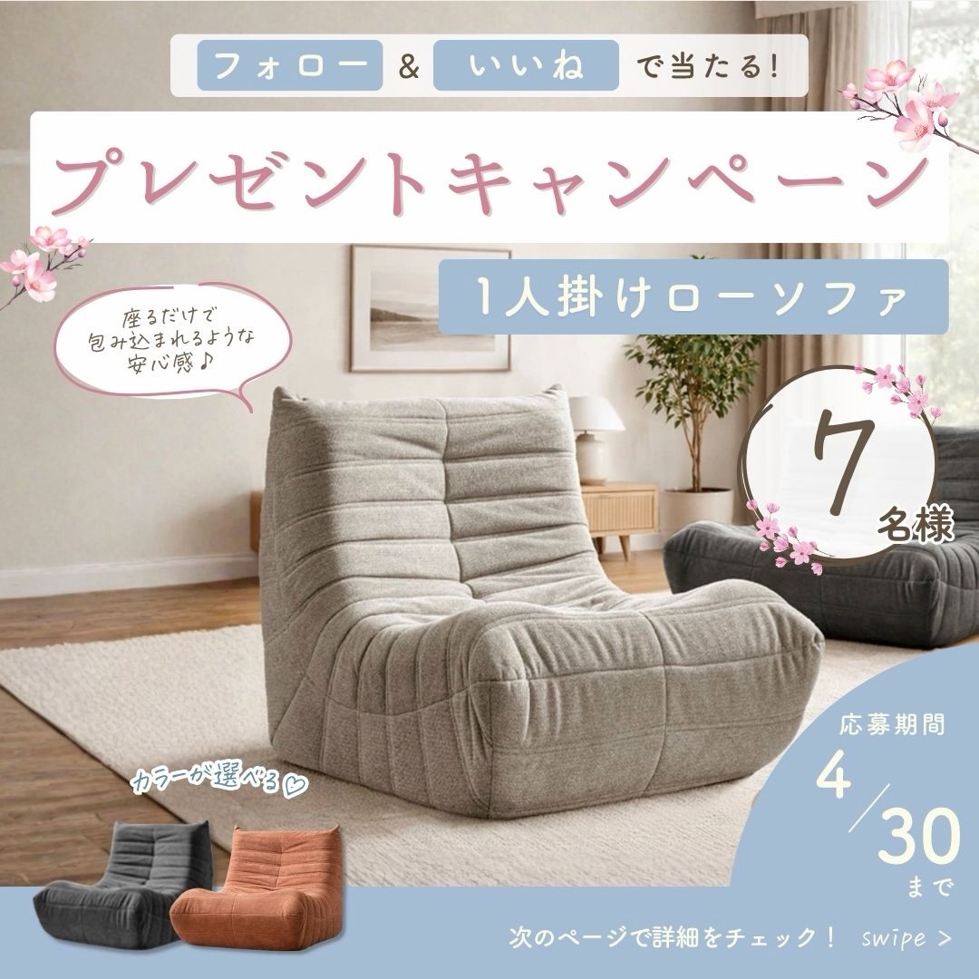 【Instagram懸賞】1人掛けローソファを7名様にプレゼント 2026.04.26feel free‐フォロー&いいねキャンペーン 賞品:1人掛けローソファ(7名様) 締切:2026年4月30日(木)応募方法: 1. 公式Instagramアカウントをフォロー 2. 対象の投稿に「いいね!」※詳細はキャンペーンページにてご確認ください。応募はこちらから