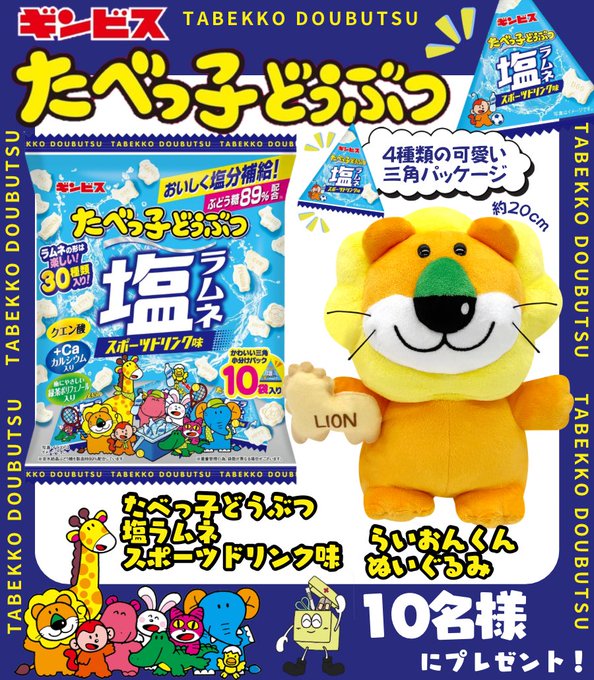 賞品:らいおんくん ぬいぐるみ&たべっ子どうぶつ塩ラムネスポーツドリンク味(10名様)