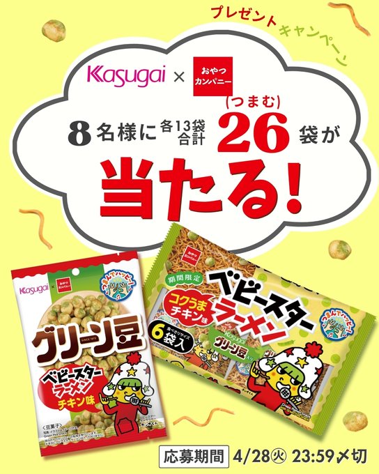 賞品:グリーン豆ベビースターラーメンチキン味&ベビースターラーメングリーン豆入りコクうまチキン味(10名様)