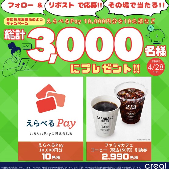 【X懸賞】えらべるPay10,000円分、ファミマカフェ コーヒー引換券が3,000名様にその場で当たる!