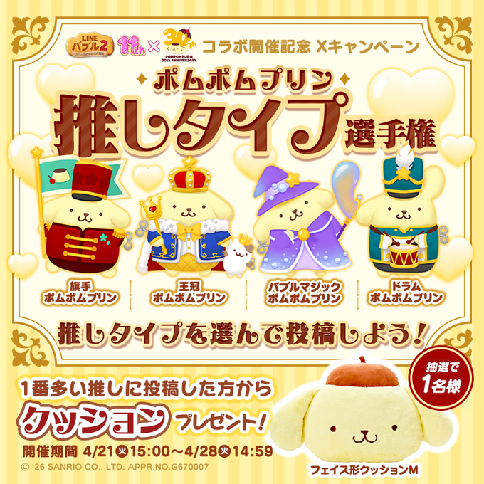 【X懸賞】ポムポムプリン クッションを1名様にプレゼント 2026.04.26LINE バブル2‐推しタイプ選手権開催 賞品:クッション(1名様) 締切:2026年4月28日(火)14:591番多い推しに投稿した方から抽選で1名様にクッションプレゼント!理由も書いてね!※詳細はキャンペーンページにてご確認ください。応募はこちらから
